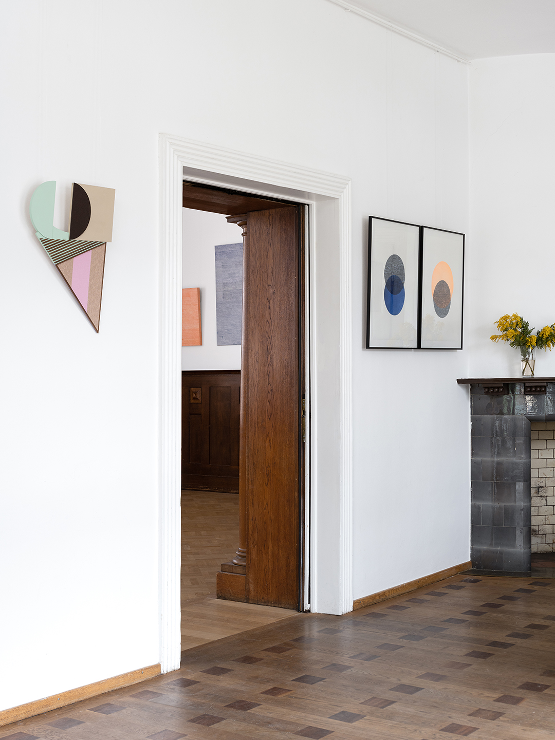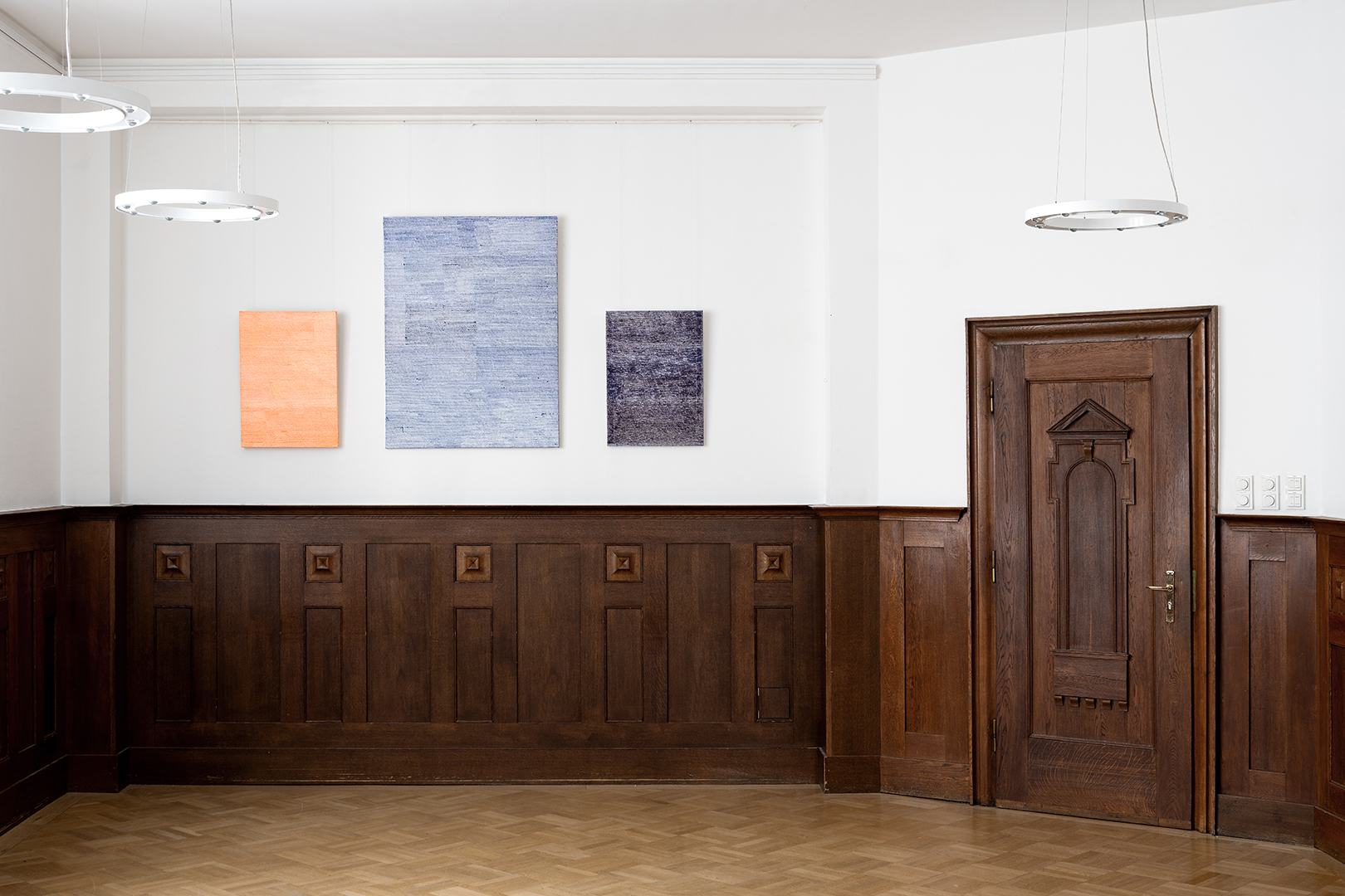 Wiederholung als beruhigende Struktur beim Machen, die meditativ wirkt und in dessen Unregelmäßigkeiten sich der Betrachter verlieren kann. Die Wechselwirkung zwischen Werk, Gestalter und Betrachter ist ein wichtiger Aspekt in Kathrins Arbeit. Die Analogie zu Materialcollagen und Farbkonzepten, die in der Innenarchitektur und Architektur erstellt werden, ist der Ausgangspunkt für Tuulikkis Arbeiten. Ordnung als ein konsequent angewendetes System, das durch Maße, Form, Struktur und Farbe ein neues Ganzes bildet.´
